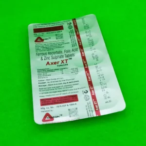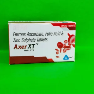 Axer XT is a comprehensive iron supplement combining Ferrous Ascorbate (iron and Vitamin C), Folic Acid, and Zinc Sulfate in tablet form. This unique formulation is designed to support iron deficiency anemia, enhance red blood cell production, and promote overall cellular health.